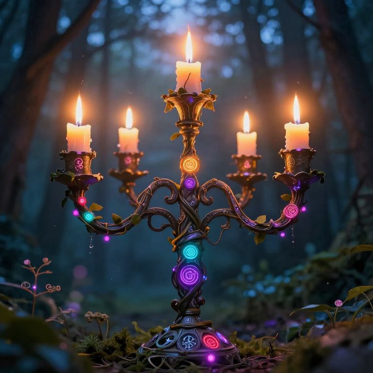 Candelabro fantasy enchanted style, glowing candles emitting magical light in vibrant colors, intricate vines and mystical symbols wrapped around the arms, floating in a mysterious forest clearing during twilight, ethereal and surreal mood, highly detailed.