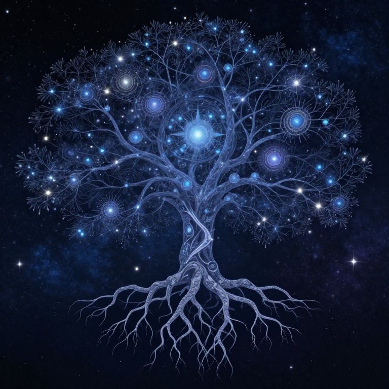 Digital artwork depicting a luminous, ethereal tree with intricate, glowing blue branches and roots against a star-studded, dark blue cosmic background. The tree is adorned with radiant, circular blue orbs and smaller, twinkling white stars, creating a celestial, otherworldly ambiance. The branches and roots are finely detailed, resembling delicate, luminescent wire. The overall style is futuristic and mystical, blending natural and cosmic elements seamlessly. The image exudes a sense of magic and wonder, with a cool color palette dominated by shades of blue and white.