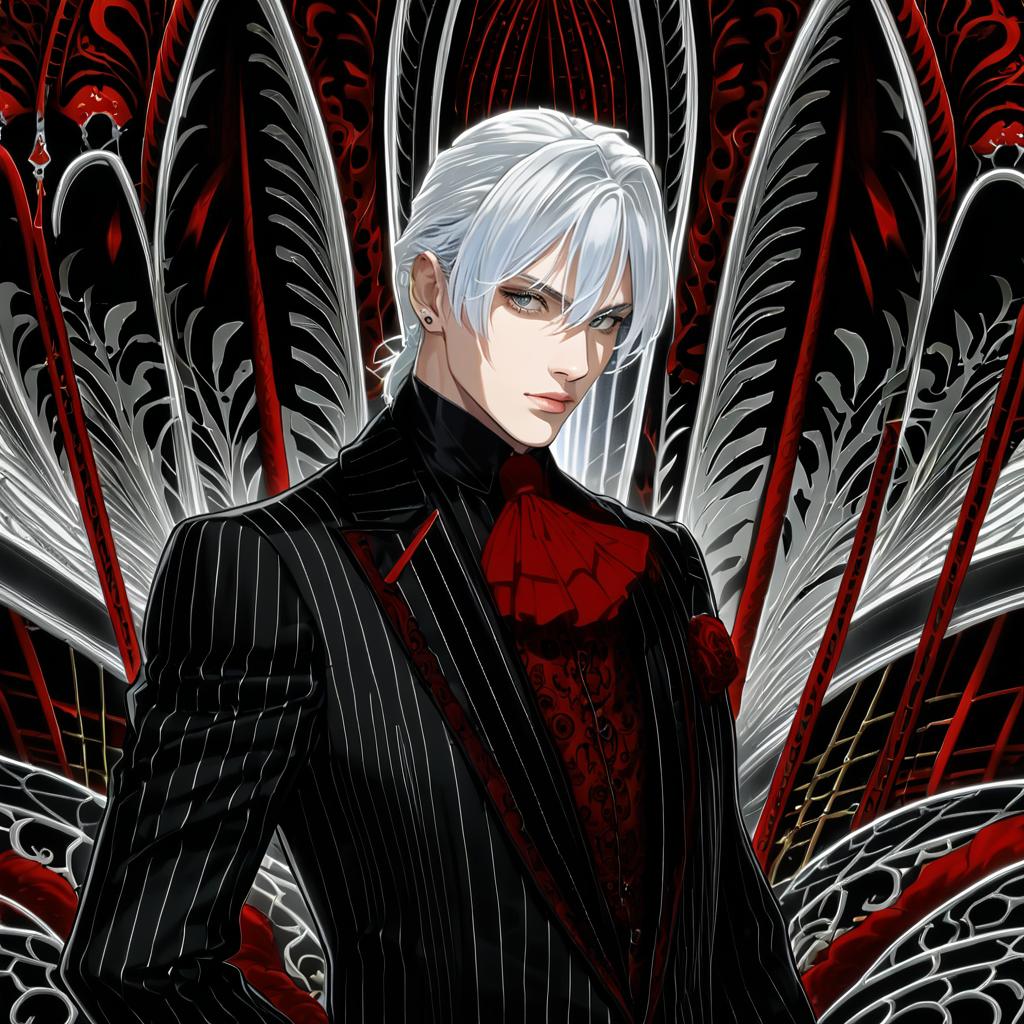 Antonio salieri (second ascension) (fate), fate/grand order, 1boy, red eyes, hair between eyes, grey hair, white hair, short hair, pinstripe suit, suit, black gloves, pinstripe suit, suit, black jacket, long sleeves, formal, half updo, formal, red ascot, by artist kobuichi, anime