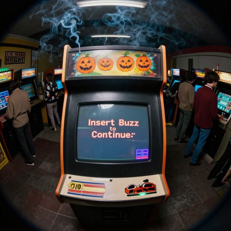 Photograph of an arcade with a brightly lit "Insert Buzz to Continue!" arcade game featuring pumpkin faces above, surrounded by players.