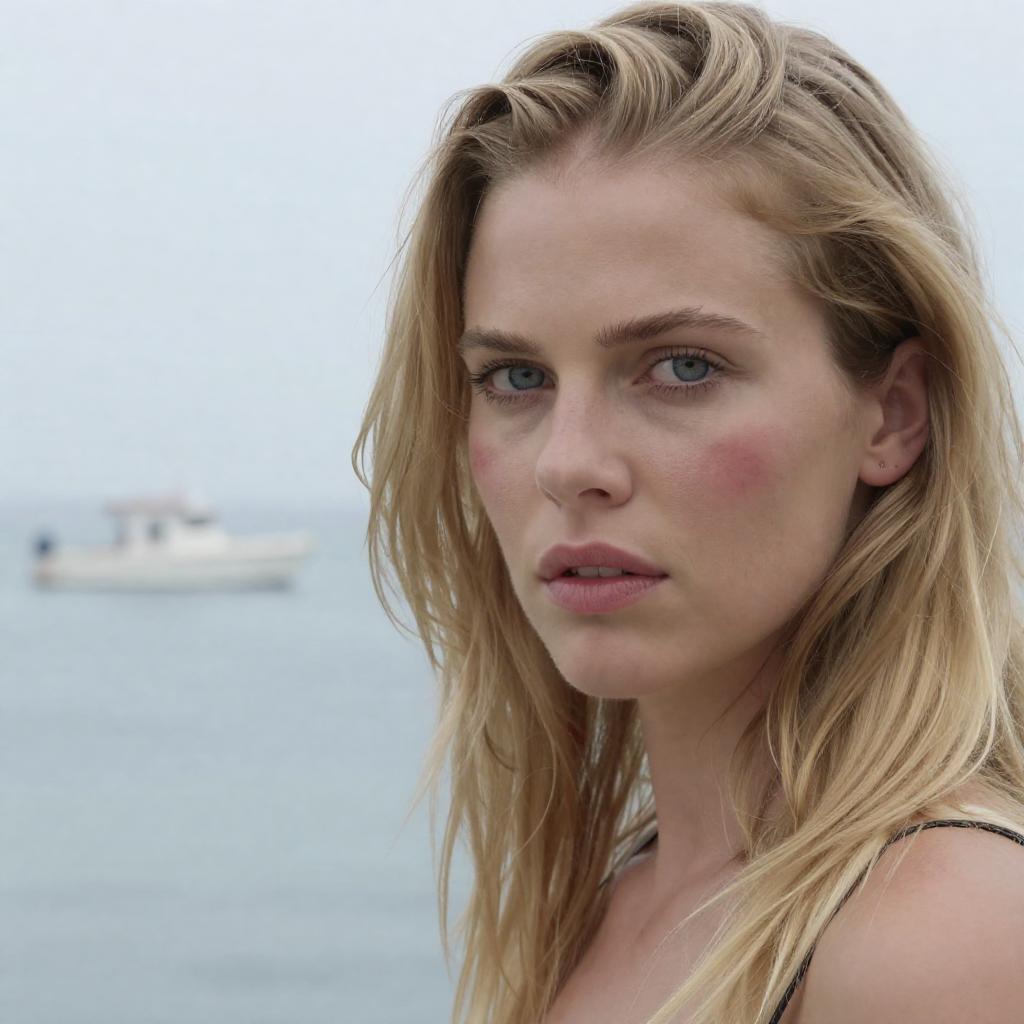 Close-up portrait of a blonde woman with light skin and blue eyes looking serious. She has loose, wavy hair and a subtle red mark on her left cheek. The background features a blurred light blue sea with a white boat and a small floating structure, creating a calm coastal atmosphere.