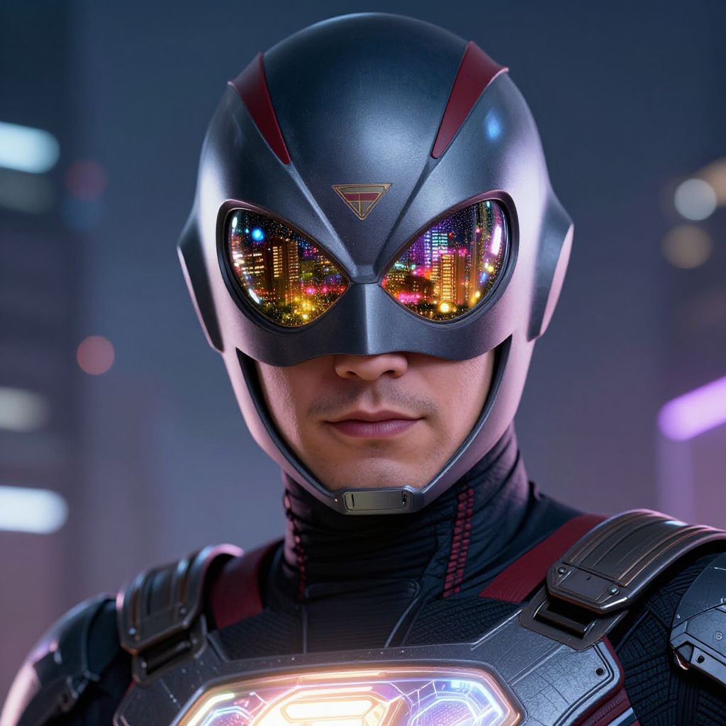 Visualize a create your own superhero avatar in a detailed close-up portrait, mask reflecting vibrant city lights, expression confident and determined, costume with futuristic tech elements and emblem glowing softly, hyperrealistic digital art.