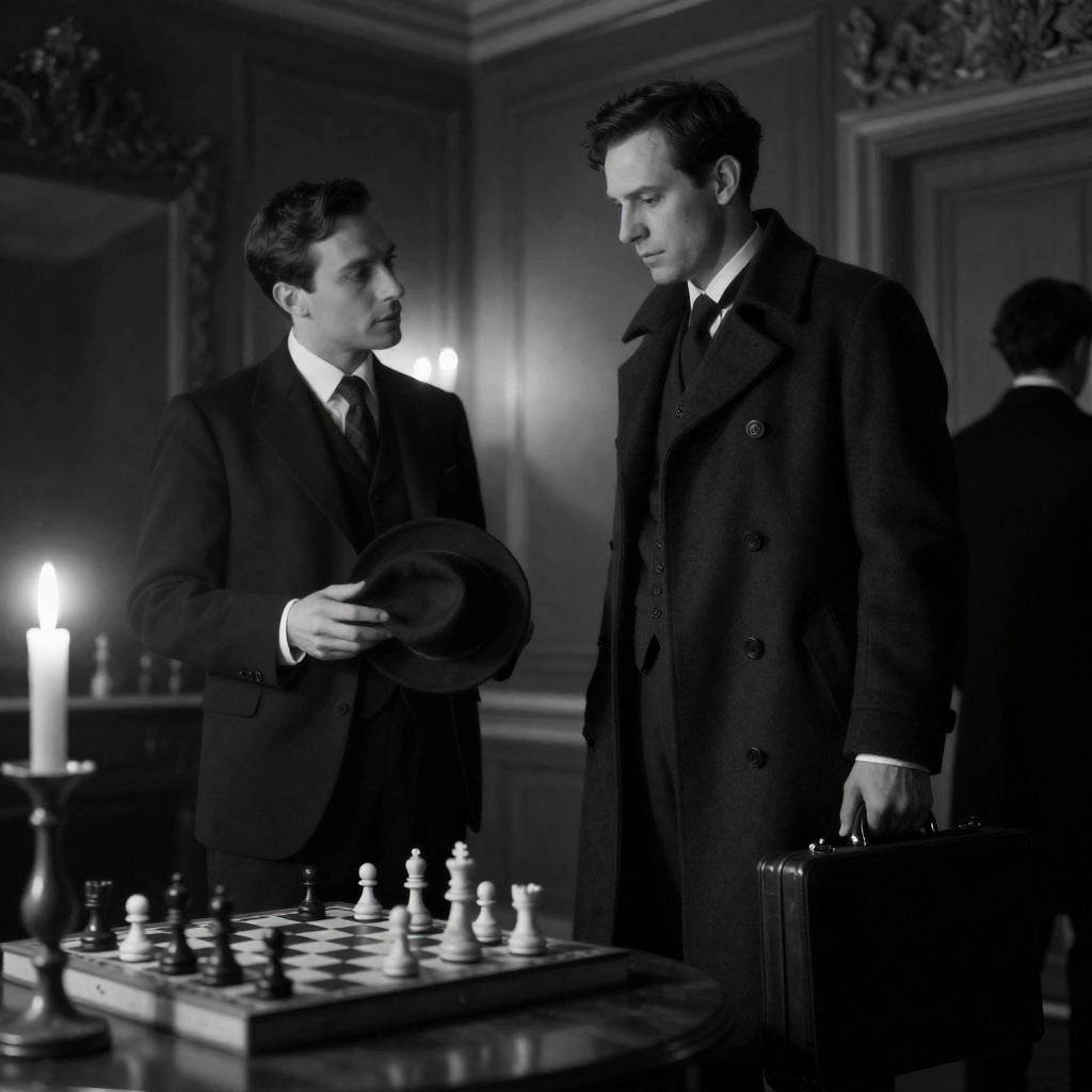 Man in gray coat and suit stands in ornate, red-draped room, facing another man in black coat. Bed with green blanket and pillows on right. Staircase in background. Ornate furniture and decorations. Intense expressions. Two people.