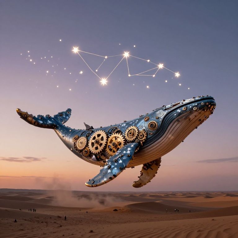 In a surreal desert expanse, a colossal clockwork whale ascends through the twilight sky, its gears whispering ancient secrets as mechanical stars dance in its wake, weaving constellations of forgotten myths and igniting a profound sense of wonder and existential mystery.