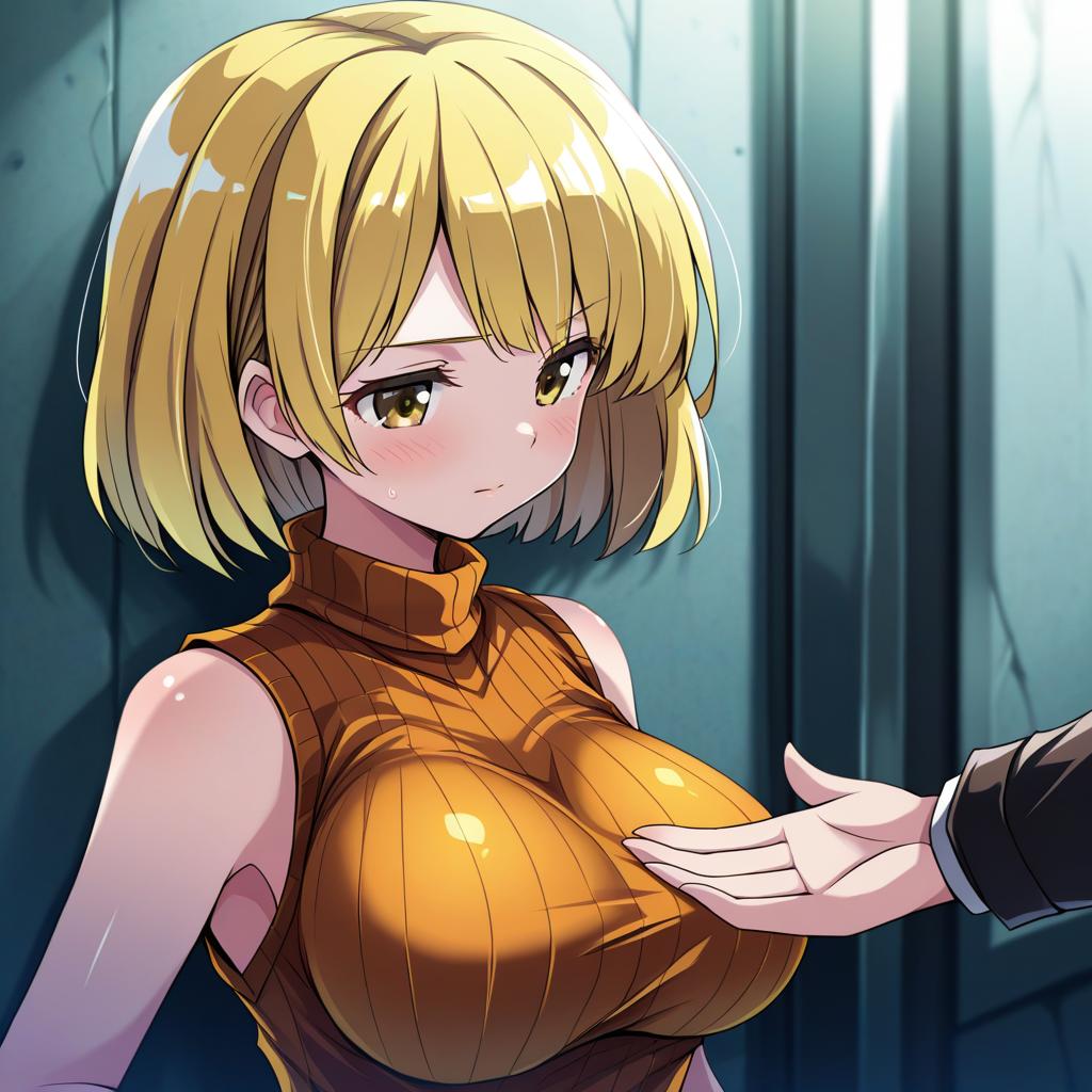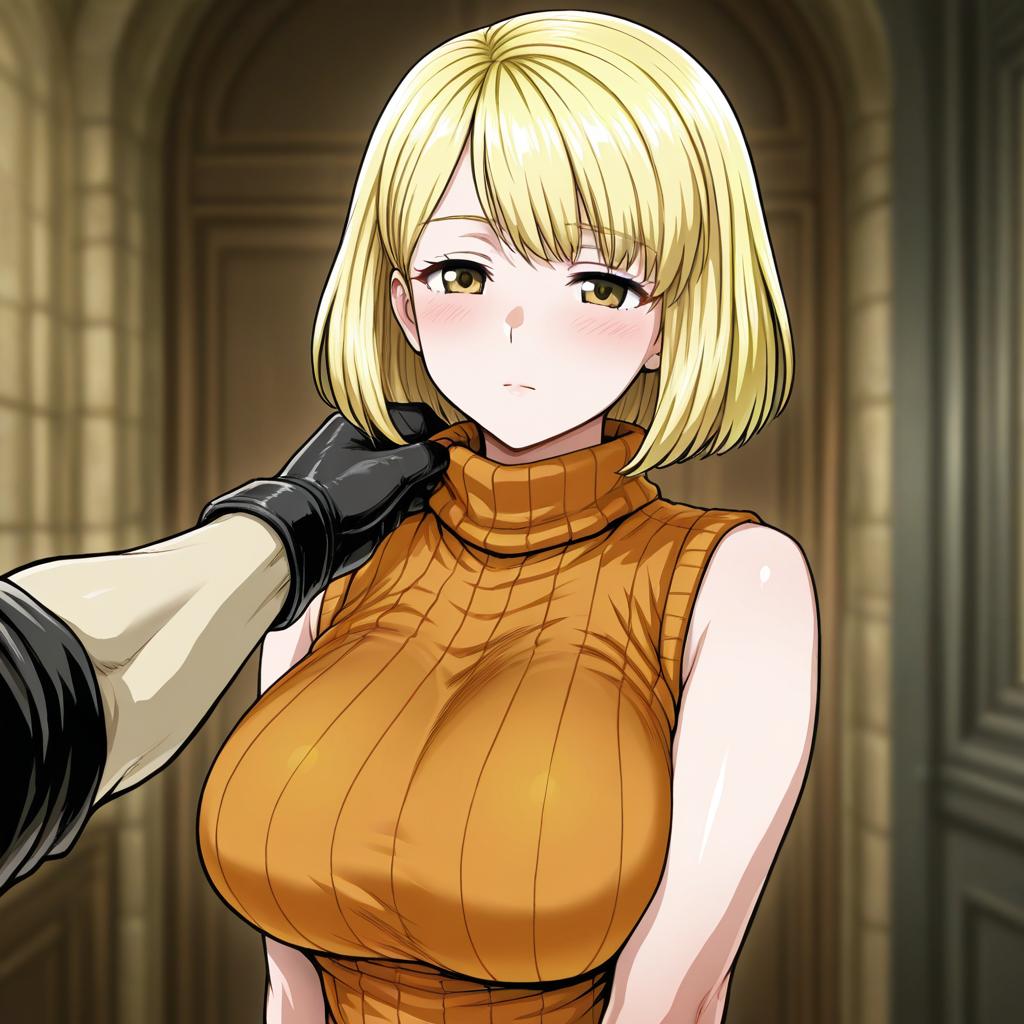 Ashley graham, resident evil, 1girl, brown eyes, blonde hair, short hair, bob cut, large breasts, sleeveless turtleneck, by artist itou yuuji, illustrious