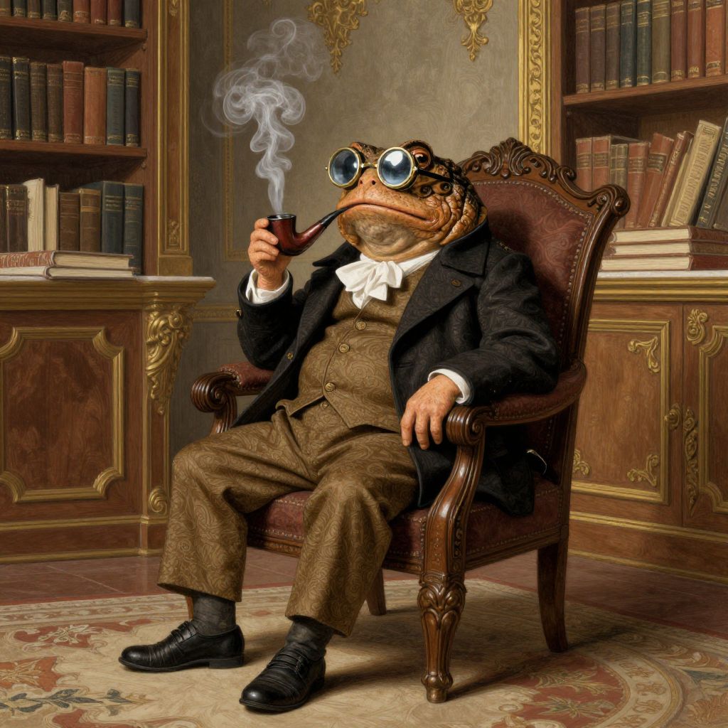 Reflection toadman, toad-human philosopher wearing monocle, sitting in baroque library in a mahogany chair, smoking pipe, illustration,