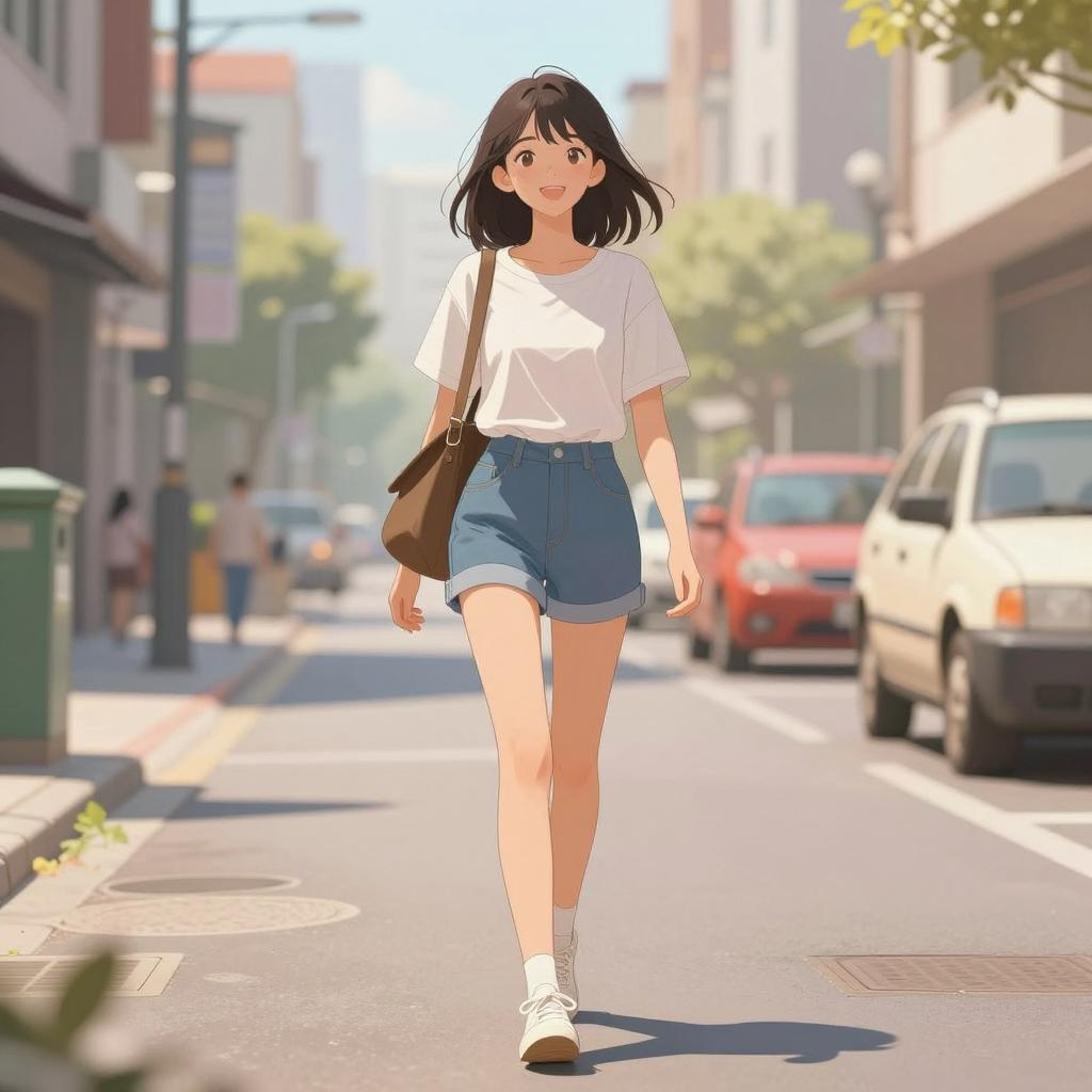 Illustration of a young woman walking confidently down a sunlit urban street. She is wearing a casual summer outfit consisting of a white t-shirt, blue denim shorts, white socks, and white sneakers. She carries a brown shoulder bag. The scene is set in a city environment with soft lighting and warm tones, creating a dreamy and inviting atmosphere.