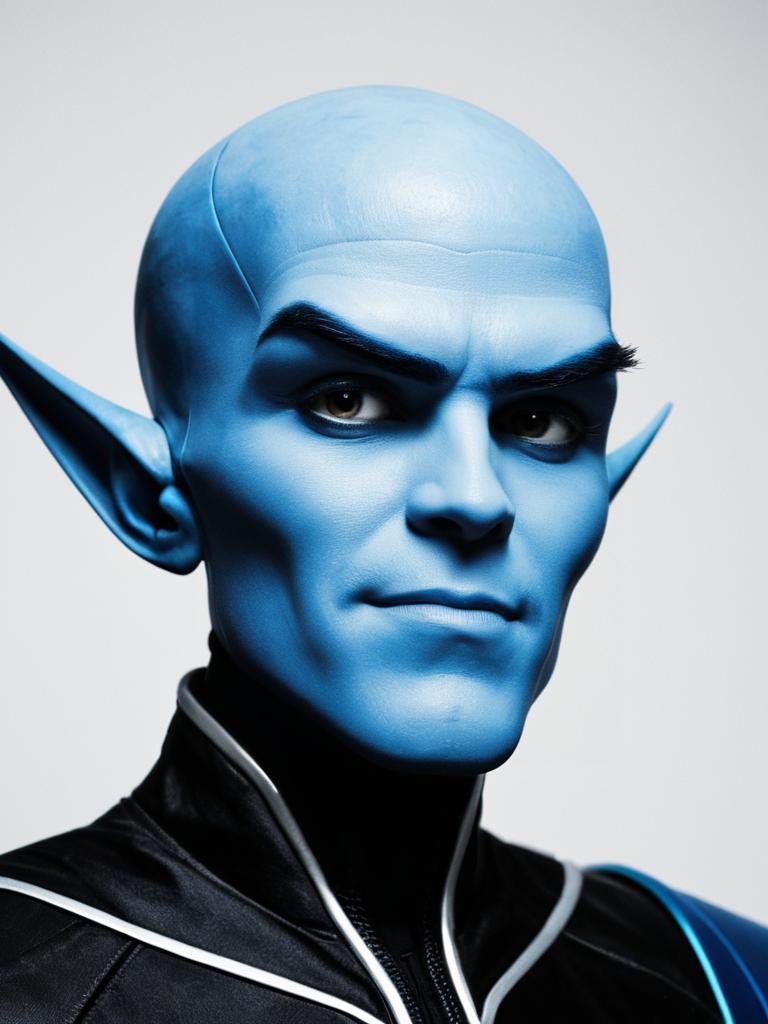 Man in Megamind costume, photorealistic studio cosplay headshot