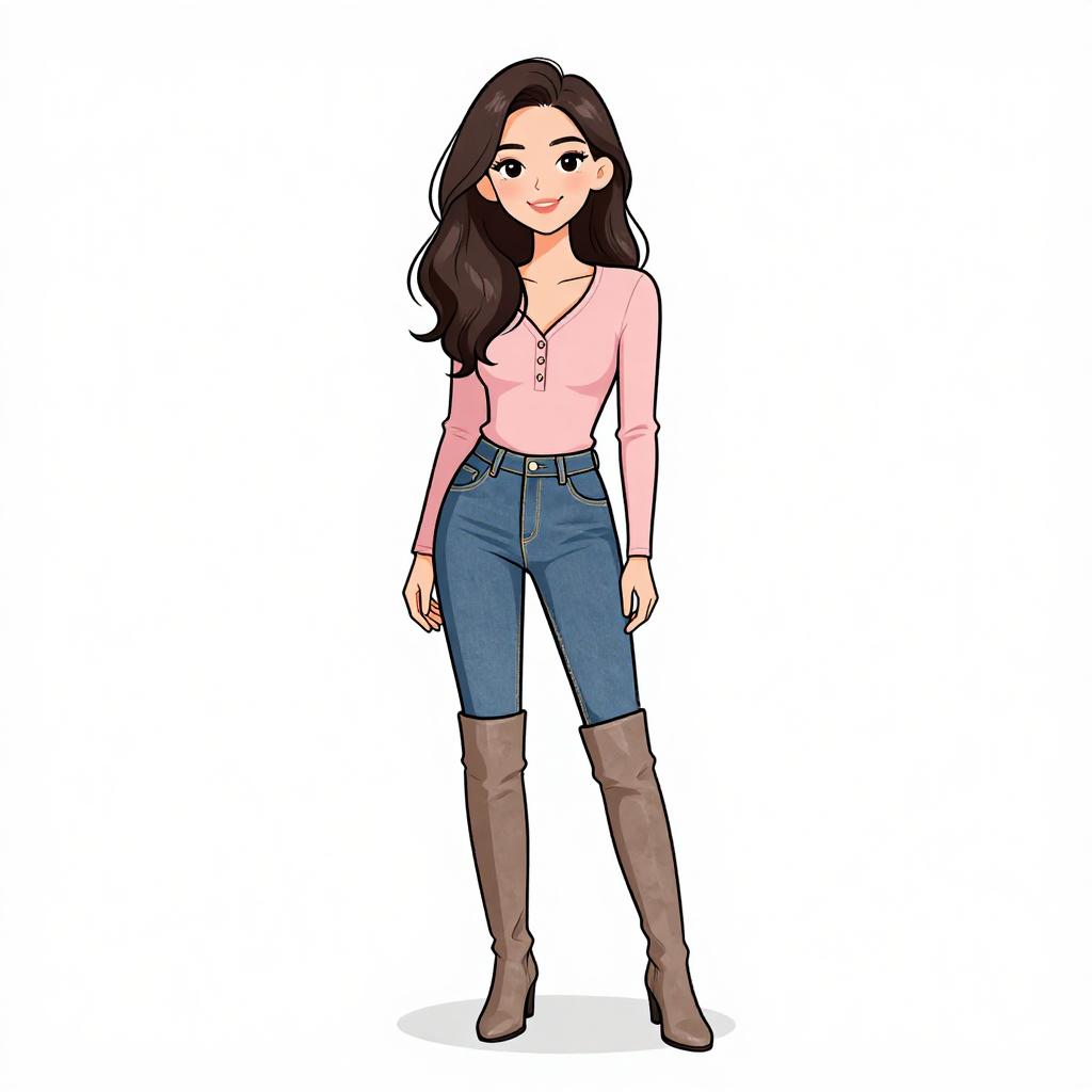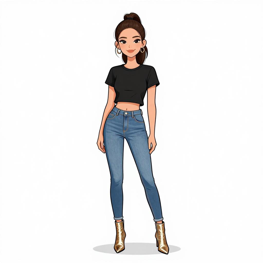 Woman with pretty face and pretty hair. smiling Woman, casual chic, black and white striped knit sweater, crew neck, long sleeves, slight crop with a front knot detail, charcoal grey skinny jeans, mid-rise, ankle-length, black ankle boots with chunky heels and buckle accents, plain white studio background. --sref 1467