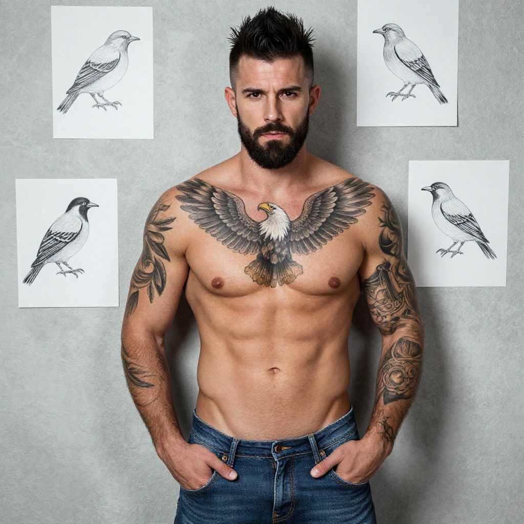 Photograph of a muscular, shirtless man with a well-groomed beard and short, spiky black hair. He has extensive tattoos, including a large eagle with wings spread across his chest and detailed designs on his arms. He's wearing blue jeans with his hands in pockets, standing against a textured, light-gray wall adorned with four black and white bird sketches. He looks directly at the camera with a serious expression.
