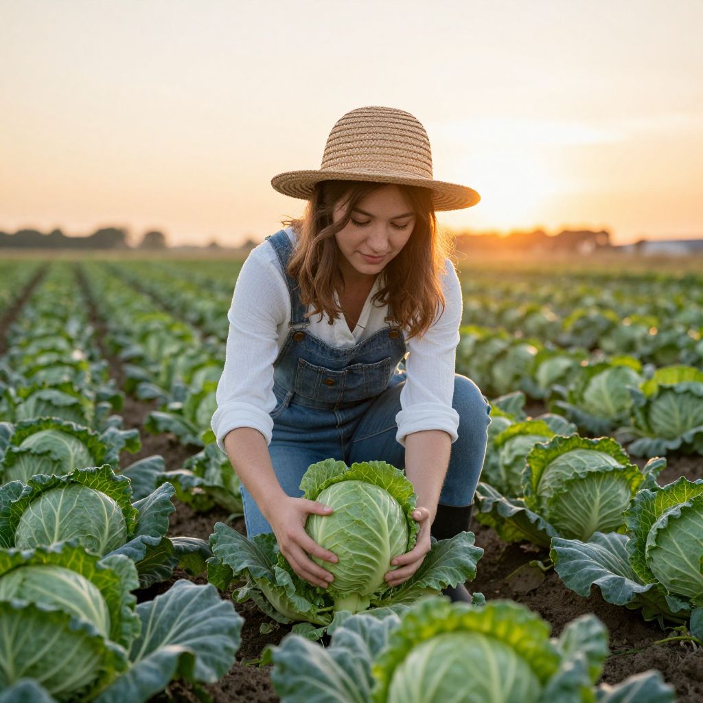 Young woman wearing a straw hat and denim overalls carefully harvesting a fresh green cabbage amidst rows of lush vegetation under a golden sunset backdrop.