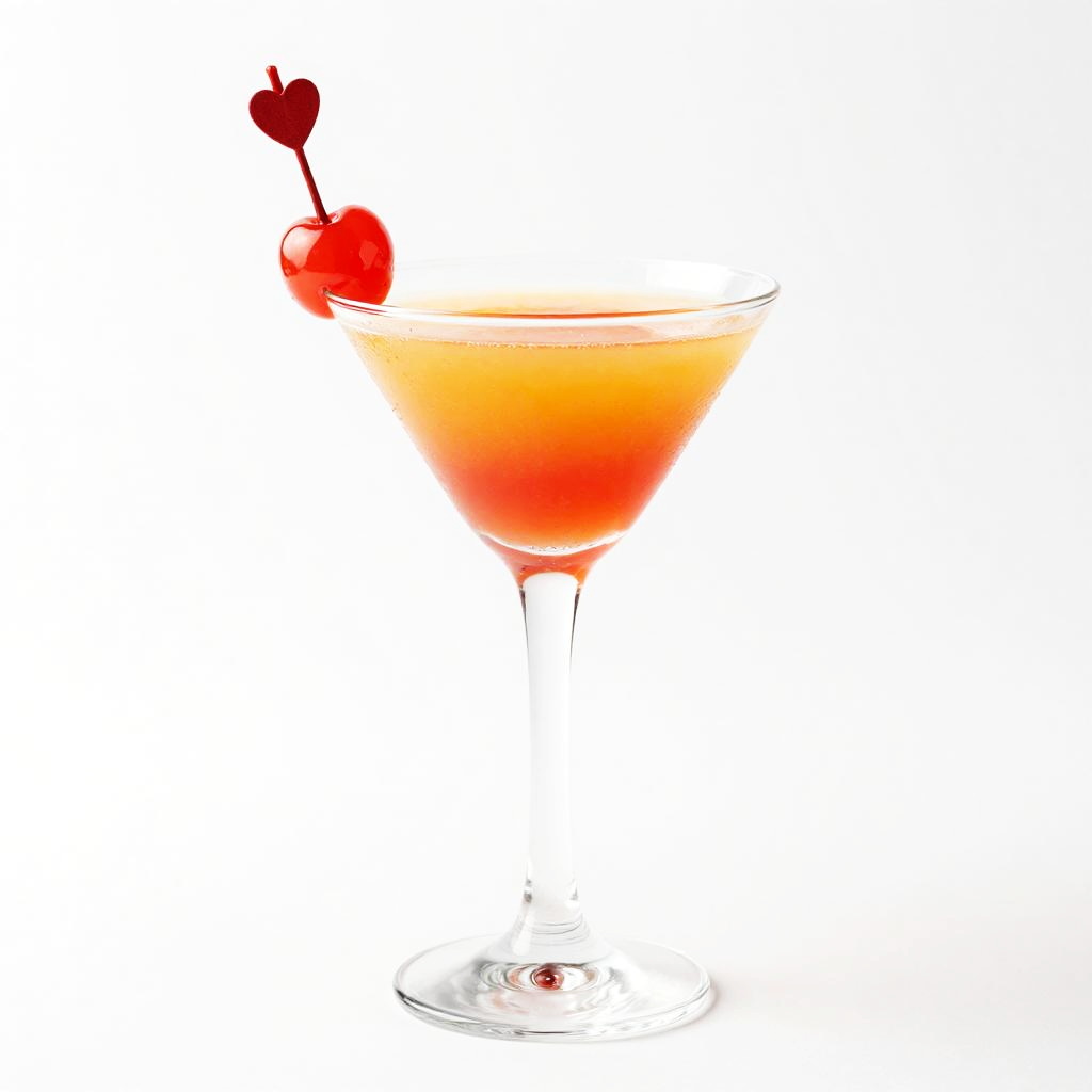 Photograph of a vibrant cocktail in a clear, elegant glass with a wide, flared rim. The drink has a gradient from bright orange at the top to deep red at the bottom. A red cherry with a small red heart-shaped pick is skewered on the rim. The background is stark white, making the colors of the drink and garnish pop. The glass has a sleek, dark base.