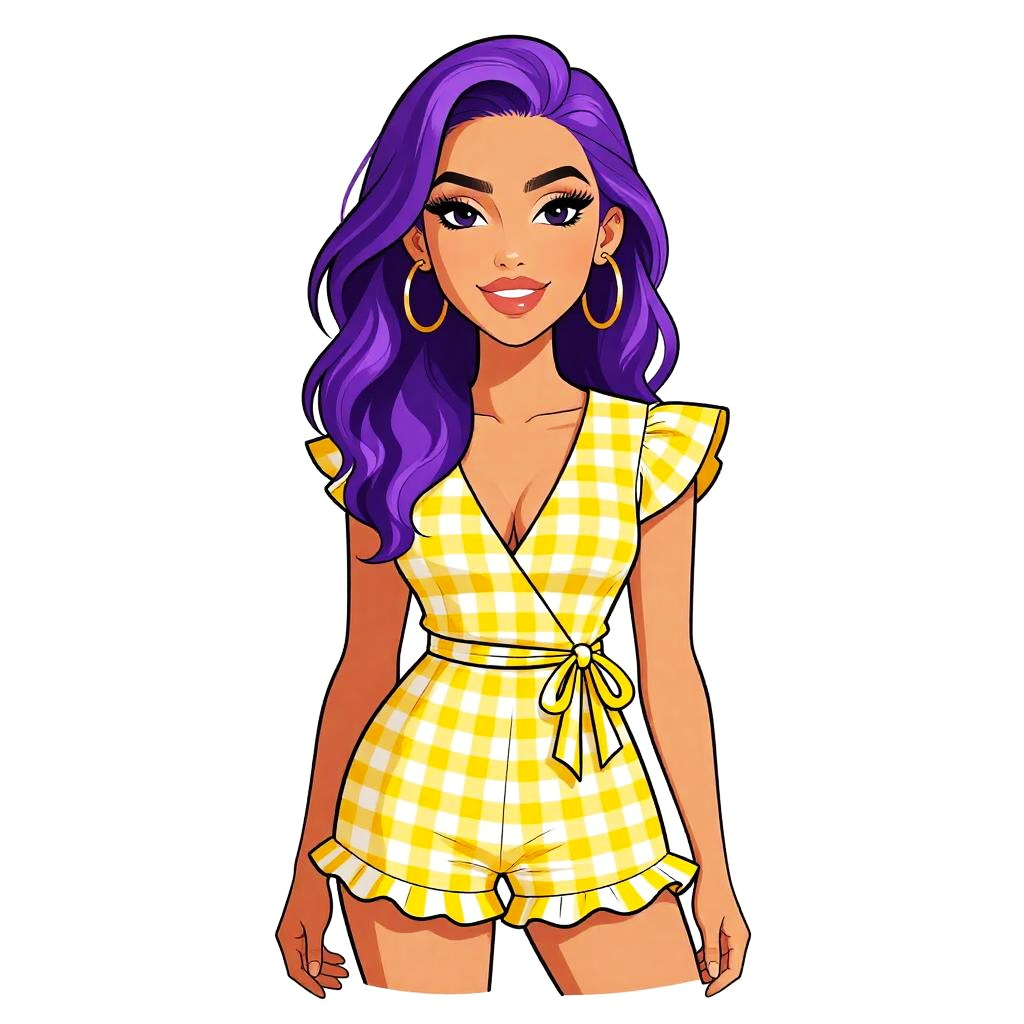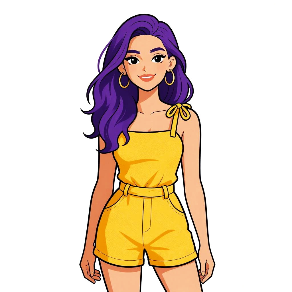 Digital illustration of a smiling woman with long purple hair, wearing yellow strapless romper, large gold hoop earrings, and white background.