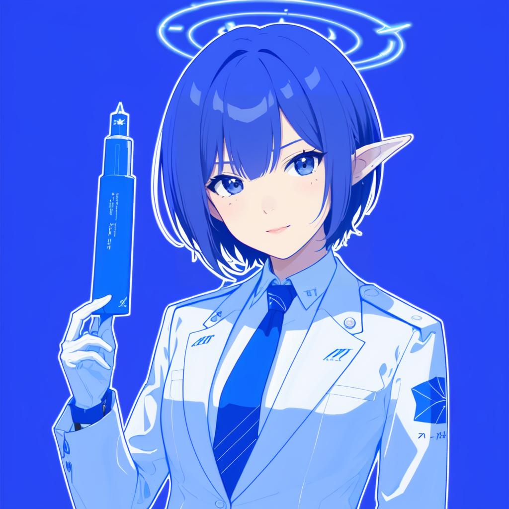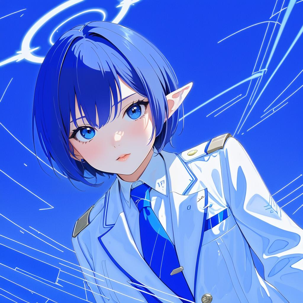 Digital illustration of an anime-style girl with short blue hair, pointy ears, and a blue glowing halo above her head. She is wearing a white military-style jacket with button details, a blue necktie with star patterns, and white gloves. The character has pale skin, light blue eyes, and a mole under her eye. The background is a solid light blue color.