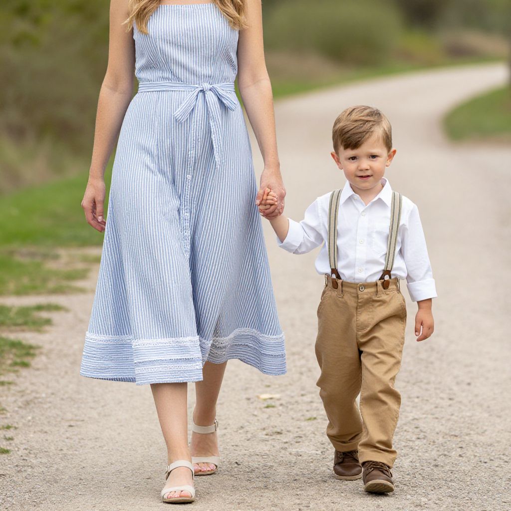 Mom and son stroll hand-in-hand along a serene dirt path, the woman wearing a blue-and-white striped shabby chic dress tied at the waist, while the young boy dons a crisp white shirt, tan pants, and suspenders, both exuding a casual yet stylish charm.