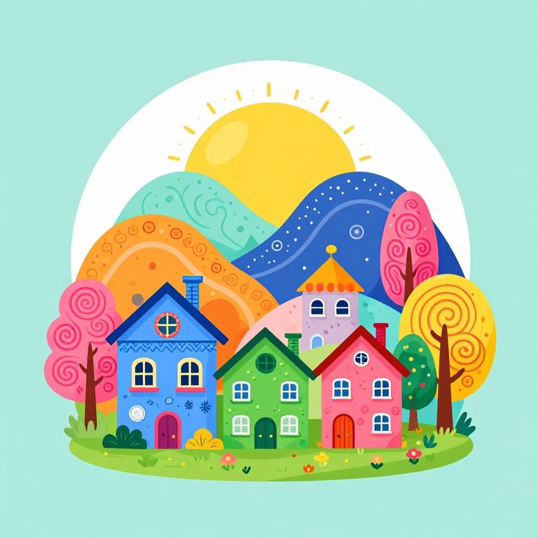 A vibrant 2D vector illustration of a whimsical village scene featuring brightly colored houses in blue, green, and pink, surrounded by trees with spiral patterns in pink, yellow, and orange. The background showcases multicolored rounded hills under a large yellow sun, framed within an oval shape. The lush green grass is dotted with small colorful flowers, creating a lively and harmonious composition.