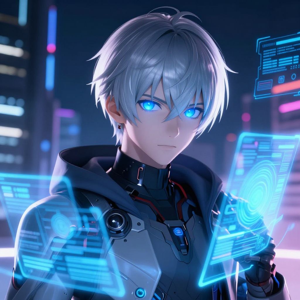 AI anime guy with a mysterious aura, half face showing intricate mechanical parts, standing in a high-tech lab filled with glowing screens and AI symbols, detailed anime illustration with a blend of realism and stylization.