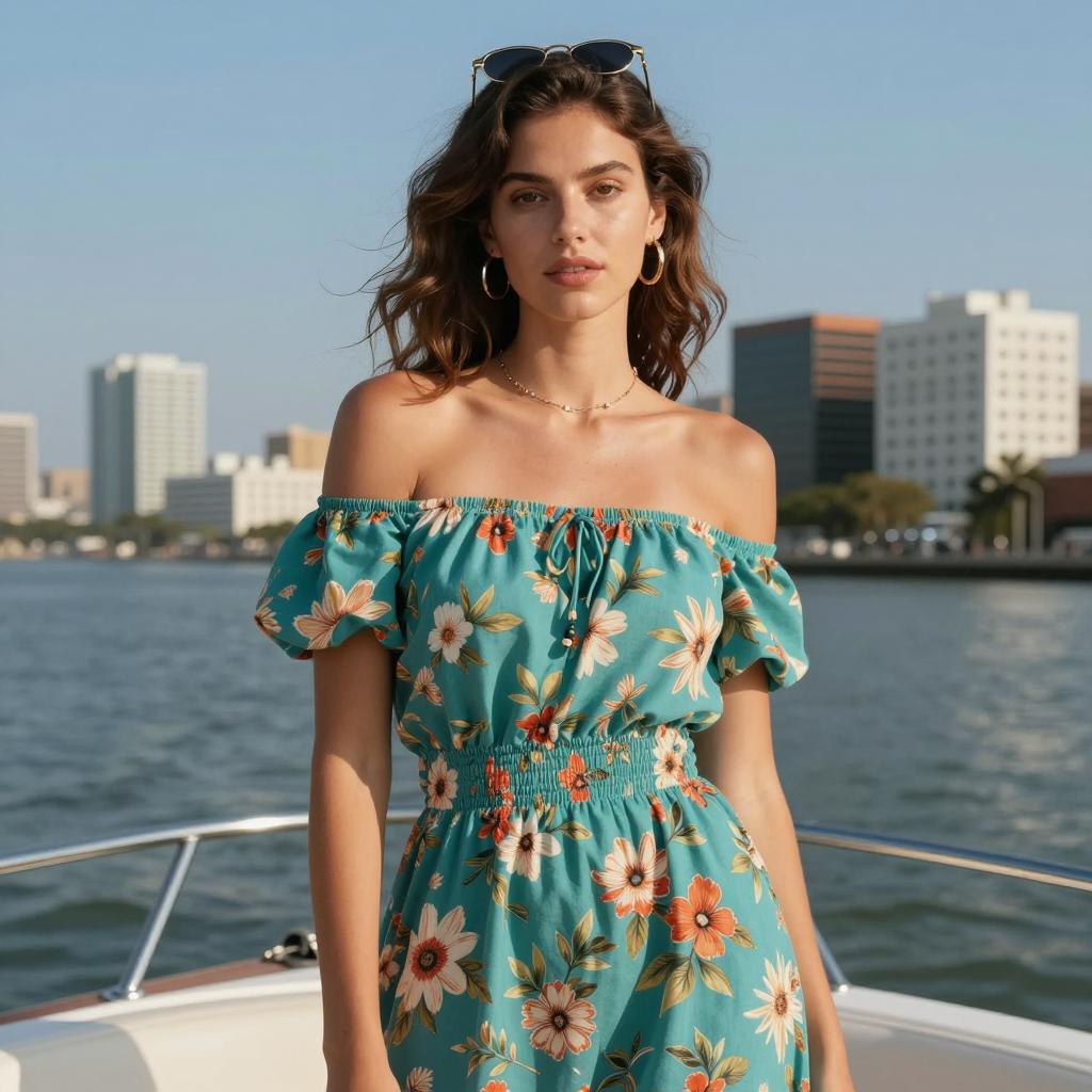 Portrait of a confident young woman with wavy brown hair wearing a teal off-shoulder floral dress, standing on a boat with water and city buildings in the background. She has sunglasses on her head and wears hoop earrings, against a clear blue sky during daytime. The image captures a casual boho summer style with realistic lighting and crisp focus in an urban waterfront setting.