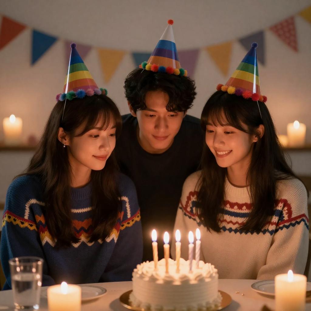 Photograph of a group of seven people in a festive setting. Central woman with wavy brown hair, red cardigan, pink dress, hands a plate to seated older man in red suit. Smiling, casual attire, Christmas tree with lights in background.