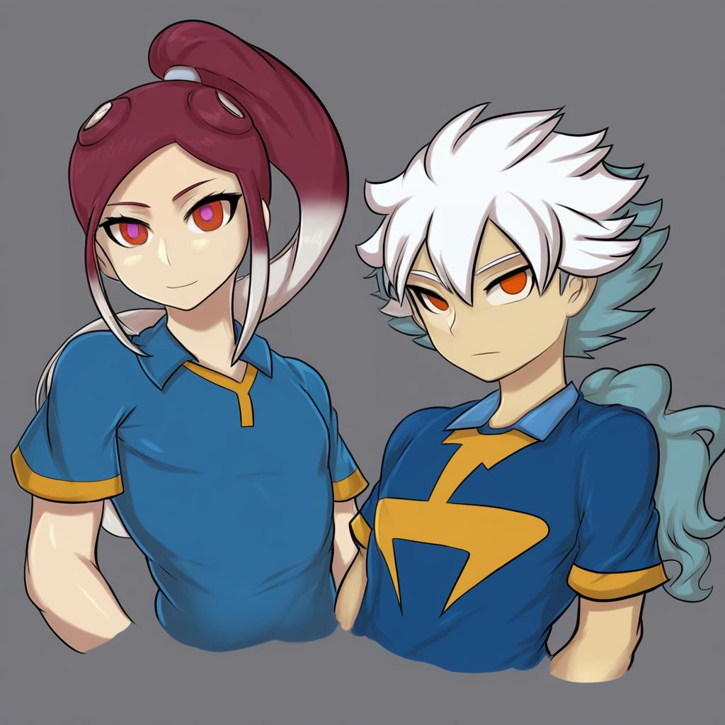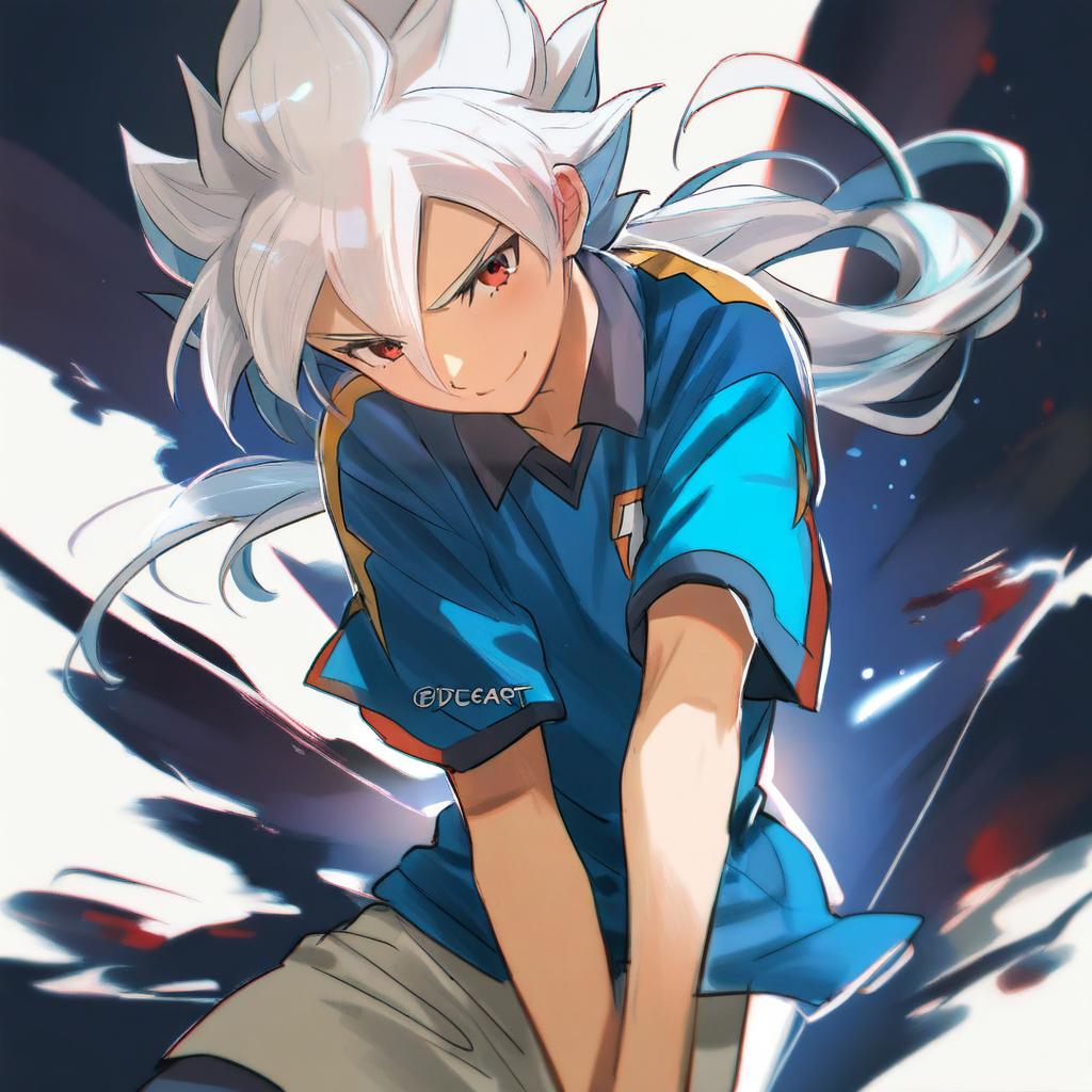 Hakuryuu (inazuma eleven), inazuma eleven (series), 1boy, red eyes, long hair, two-tone hair, white hair, ponytail, soccer uniform, by artist kiri futoshi, illustrious