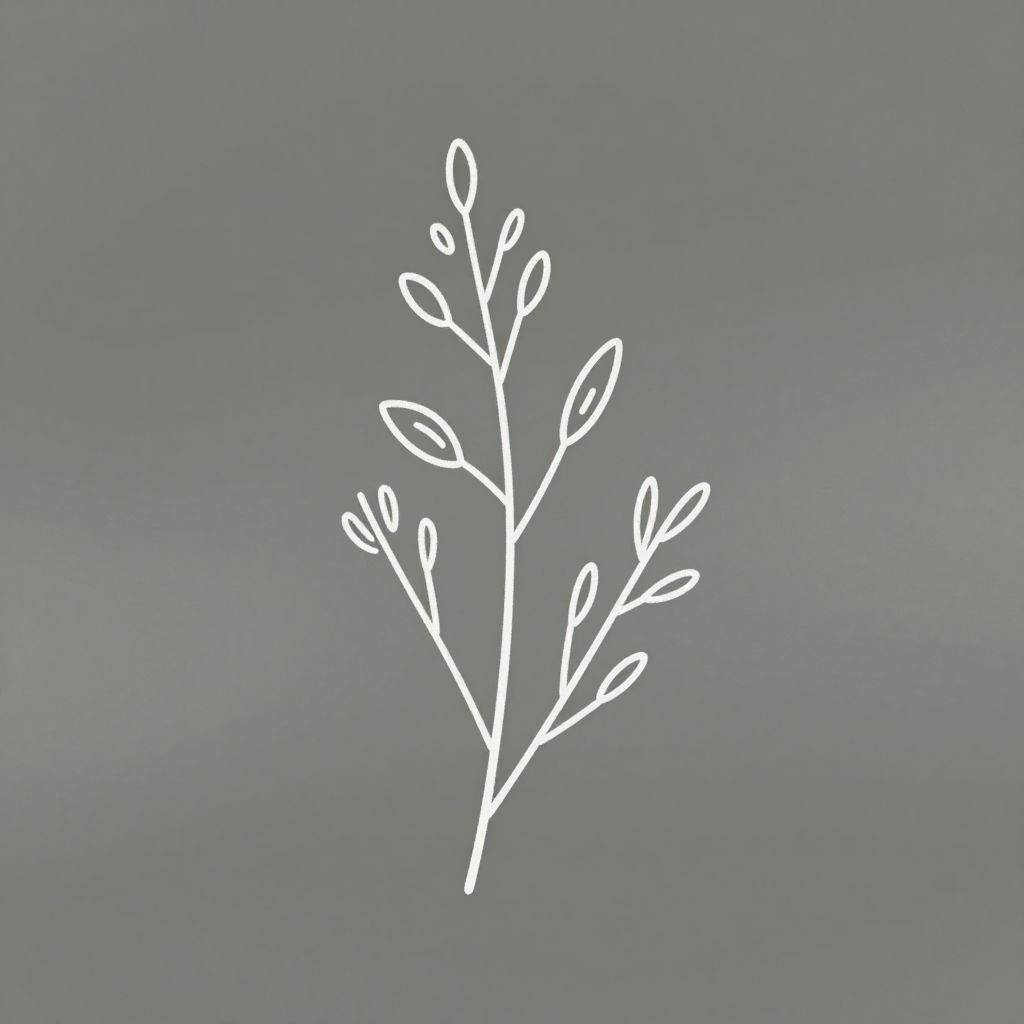 A simple digital drawing of a white, minimalist botanical branch against a solid, gradient gray background. The branch has several slender, straight stems with elongated, oval-shaped leaves and small, rounded buds at the ends. The lines are clean and slightly thick, creating a modern, minimalist aesthetic. The background is smooth and evenly shaded, providing a subtle contrast to the white branch. The overall style is minimalist and contemporary, focusing on simplicity and clean lines. The image is centered, with the branch standing out prominently against the gray backdrop.