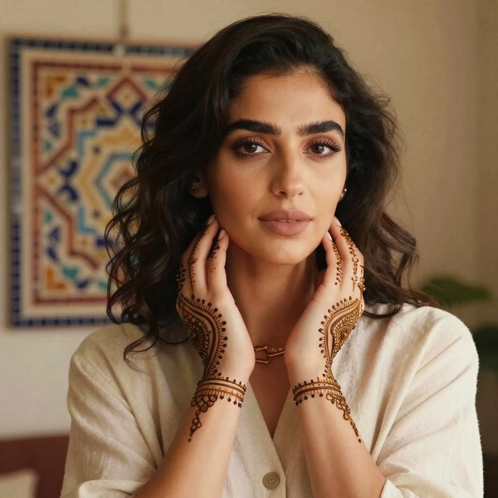 Close-up of a beautiful Syrian woman with traditional henna patterns on hands, confident and graceful, soft focus background with ancient mosaic art, warm, earthy tones