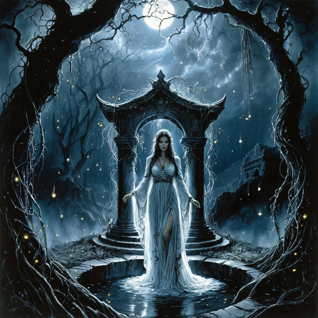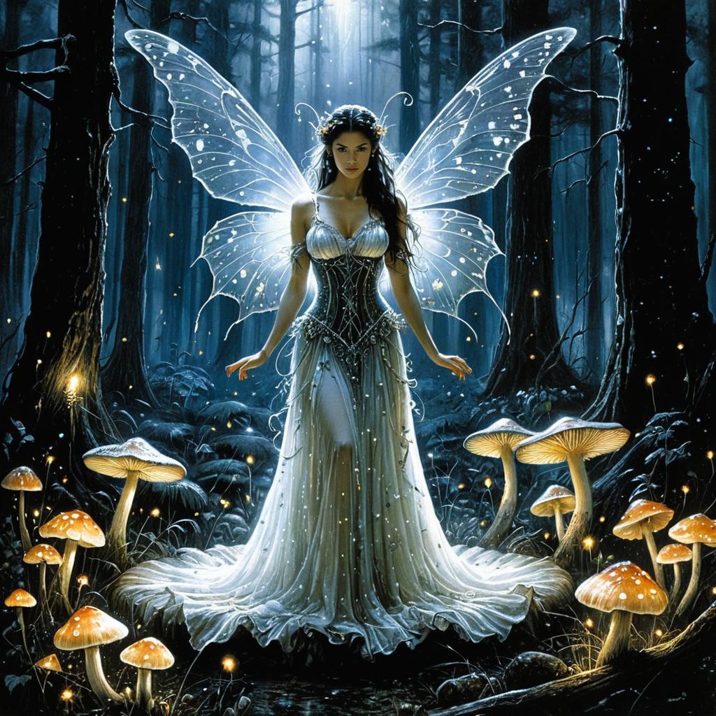 Illustration by Luis Royo depicting an ethereal fairy dancing on a bed of glowing mushrooms, adorned with translucent wings and a gown made of morning dew. Around her, twinkling fireflies and towering ancient trees form a magical woodland, while her piercing gaze seems to pull the viewer into a dangerous and otherworldly realm. The scene is both seductive and foreboding, blending elegance with a sense of menace.