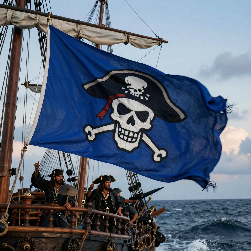 Epic pirate diffusion adventure aboard a grand sailing ship battling a stormy sea, dynamic waves crashing, pirates with tattered clothes and muskets, detailed sails catching the wind, intense expression, dramatic clouds and sunset, hyper-realistic style blending fantasy and realism.