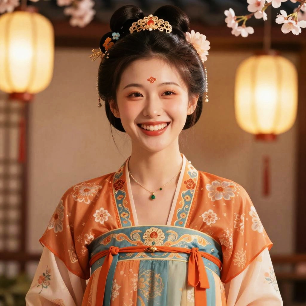 Chinese smiling face, vibrant traditional attire, soft natural lighting, warm and joyful expression, intricate background with lanterns and cherry blossoms, high-detail portrait, photorealistic style