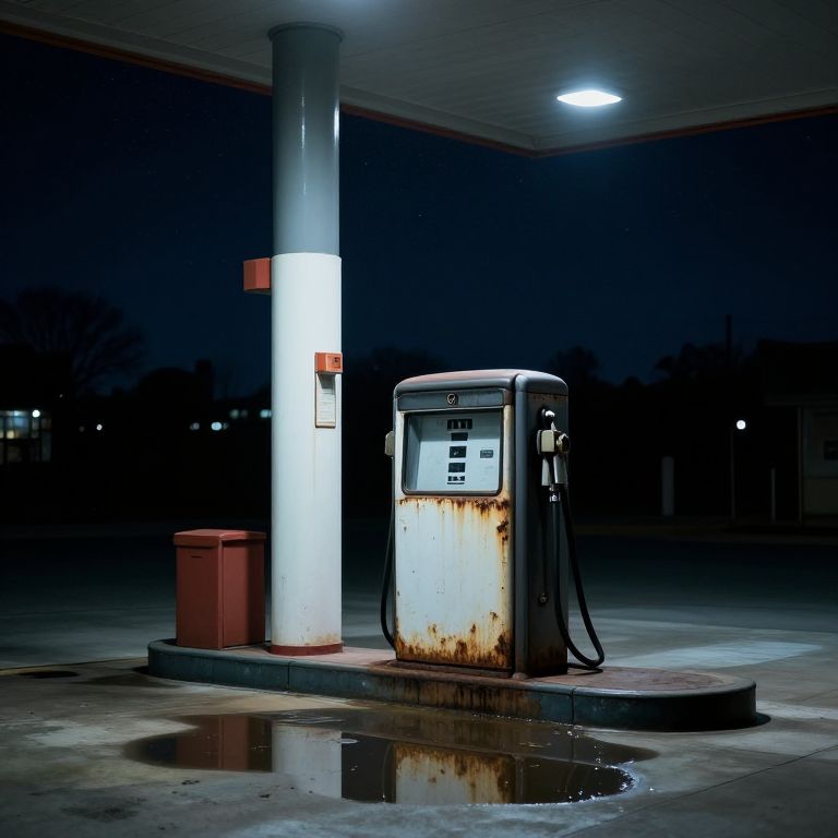 Empty gas station at night under a starry sky, old rusted fuel pumps reflecting in puddles, distant faint city lights, moody and quiet environment, photorealistic style with high contrast and subtle blue tones.