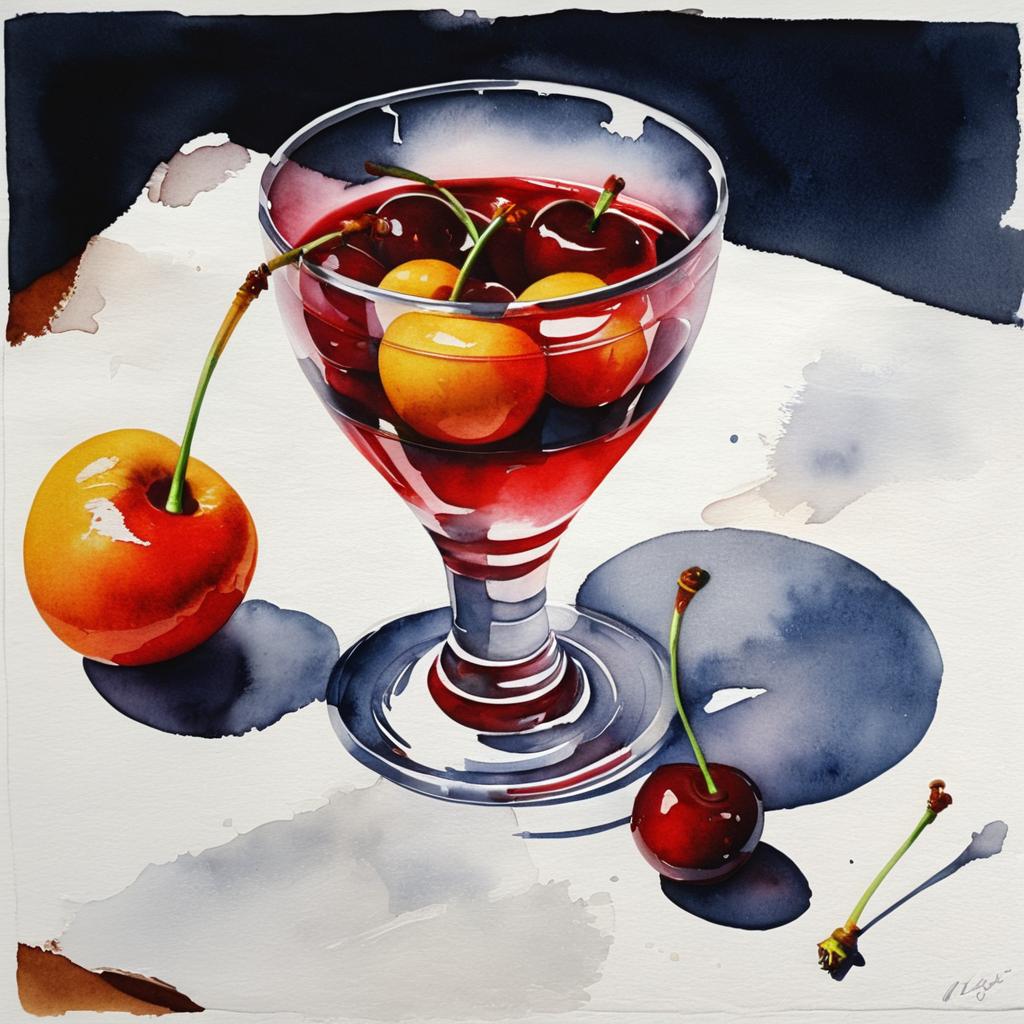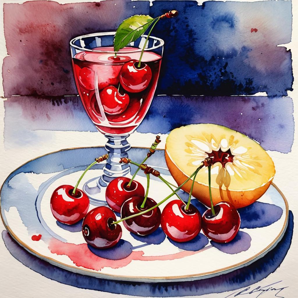 No humans, food, fruit, cup, traditional media, still life, dated, food focus, drinking glass, signature, cherry, glass, painting (medium), drink, artist name, watercolor (medium)