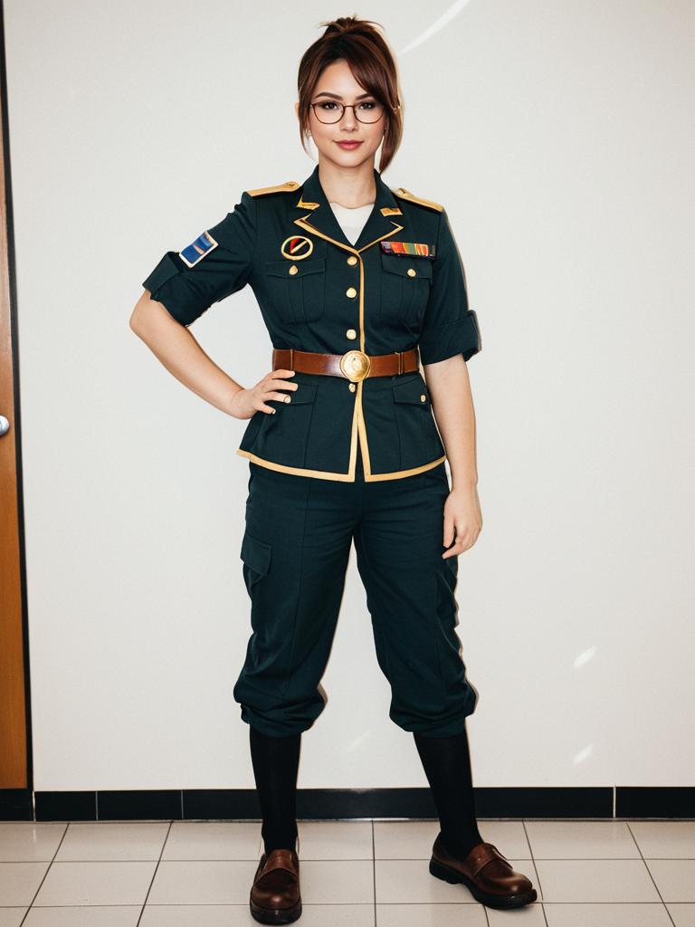 Photo-realistic cosplay photo of person in hange zoe costume. Full body. Standing. Full length. 1girl, brown eyes, glasses, brown hair, short hair, ponytail, paradis military uniform