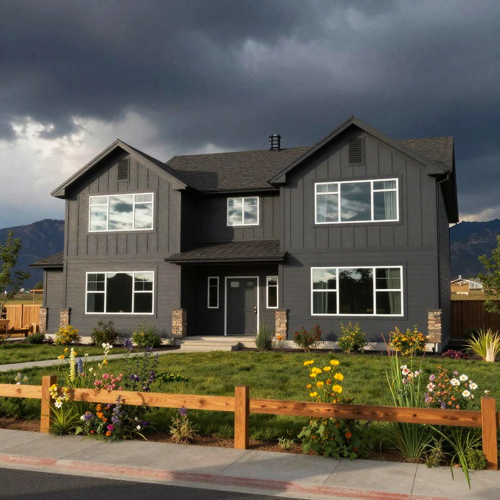 Photograph of a two-story, navy blue suburban house with white trim, gable roof, two windows, white garage door, and small flower garden