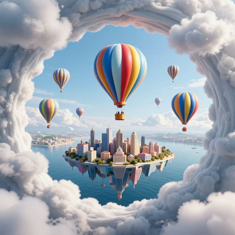 A digitally illustrated fantasy scene features a floating city with tall skyscrapers and greenery, surrounded by calm blue water. The city is framed by a cloud archway with vibrant, multicolored hot air balloons hovering above. The sky is bright blue with fluffy white clouds. The hot air balloons are striped in red, blue, yellow, and white. The reflection of the city in the water adds a surreal touch. The overall style is whimsical and dreamlike, with a focus on bright colors and smooth textures.