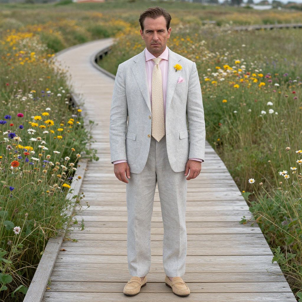 A man, light gray linen suit, pale pink dress shirt, textured silk tie, tan suede loafers, understated lapel flower, wooden boardwalks winding through vibrant wildflowers, cri film style, confident expression, soft sunlight illuminating the scene. Man has masculine face and piercing eyes