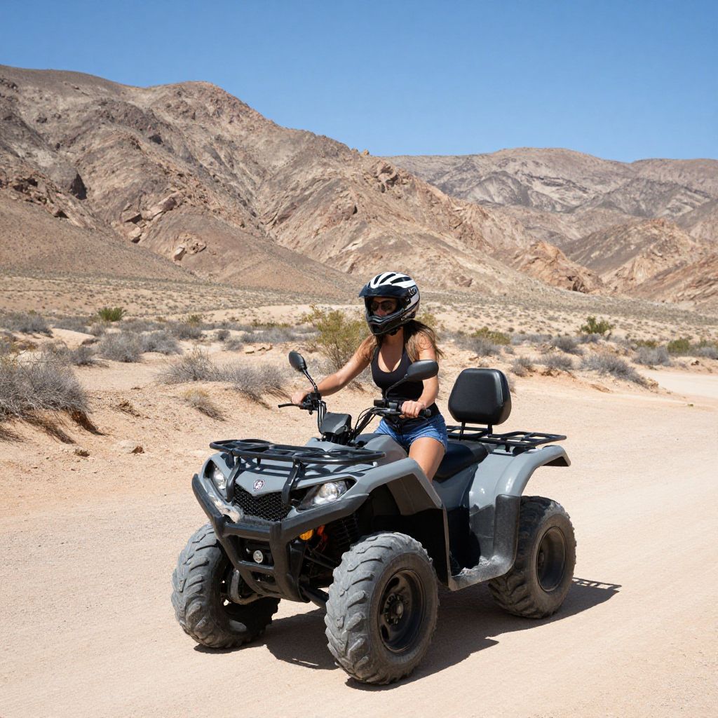 Adventure unfolds as a woman rides a sleek gray ATV through the arid landscape of Jawbone Canyon, surrounded by rugged mountains and sparse desert vegetation under a clear blue sky.