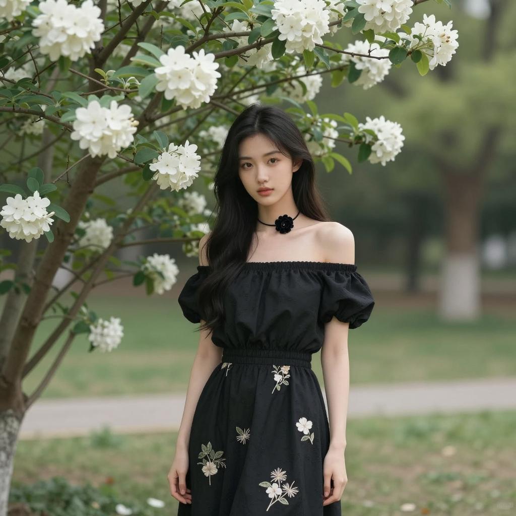 Young woman with long dark hair, wearing a white, sleeveless, ruffled dress, sitting on large rocks, legs crossed, sandals on. Background: blue industrial building, white truck, black car, gravel ground, clear sky, clouds. Two people walking in background.
