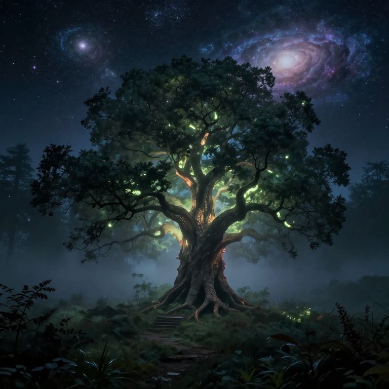 Mysterious, sci-fi tree with glowing blue orbs, intricate roots, and a glowing heart at its base, set in a foggy forest. Digital