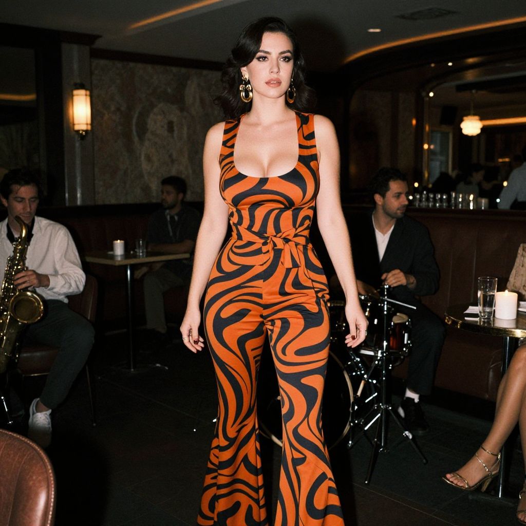 A willowy woman, chromogenic film style, retro-inspired sleeveless top with bold orange and black swirl print, scoop neckline, cinched waist with a tie-up belt, matching flared trousers, high-rise waist, statement gold hoop earrings, strappy gold sandals, at a chic music lounge, enjoying a live jazz performance. Sexy. Pretty face and beаutiful eyes. Big breasts