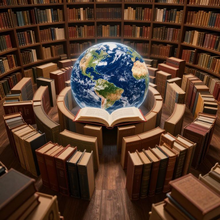 Photograph-like digital artwork of a library with curved wooden bookshelves filled with books surrounding a glowing, illuminated globe centered on an open book. The globe shows detailed Earth with visible continents and oceans, and the open book has visible text. The bookshelves are made of dark wood with golden-brown spines, creating a warm, rich atmosphere. The globe's bright blue and green contrast with the darker tones of the library, emphasizing the central, mystical focus. The image blends realistic elements with a surreal, symbolic representation of knowledge and the universe.