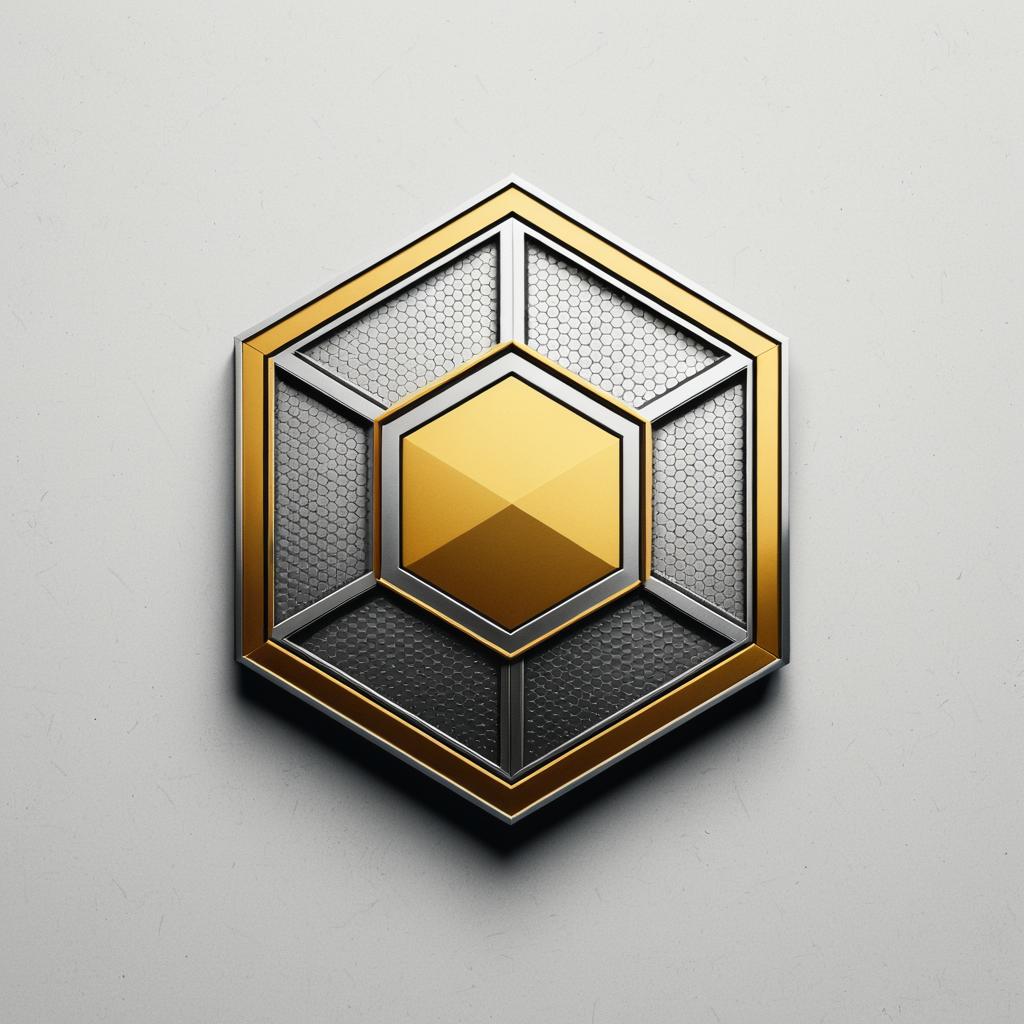A golden yellow and silver hexagonal emblem symbolizing elegance. Simple and elegant, easily converted to vector artwork, designed with dominance of gold, minimalist and refined