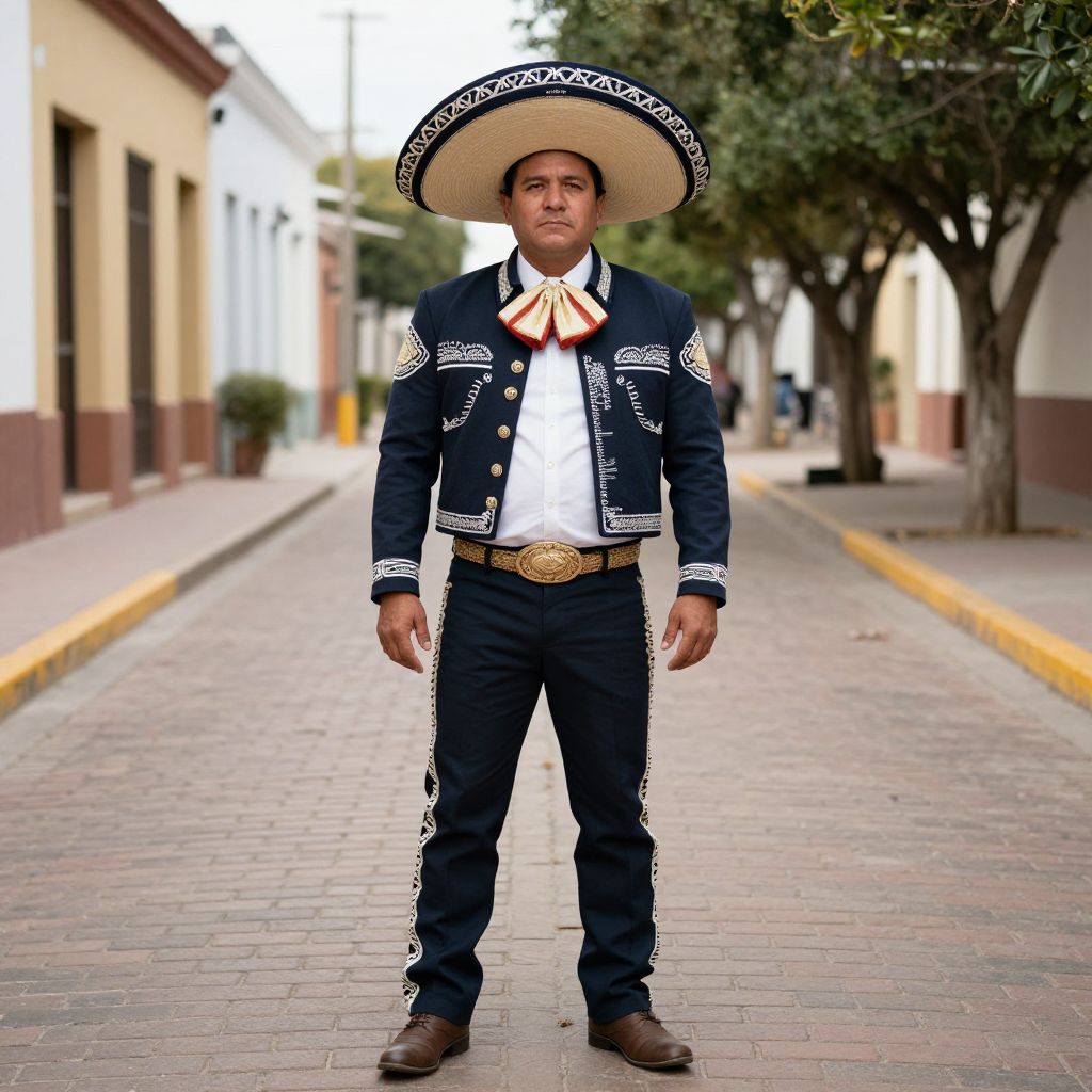 Photograph of a Mexican man standing on a street, wearing a large sombrero, dark blue charro suit, white shirt, and brown belt,