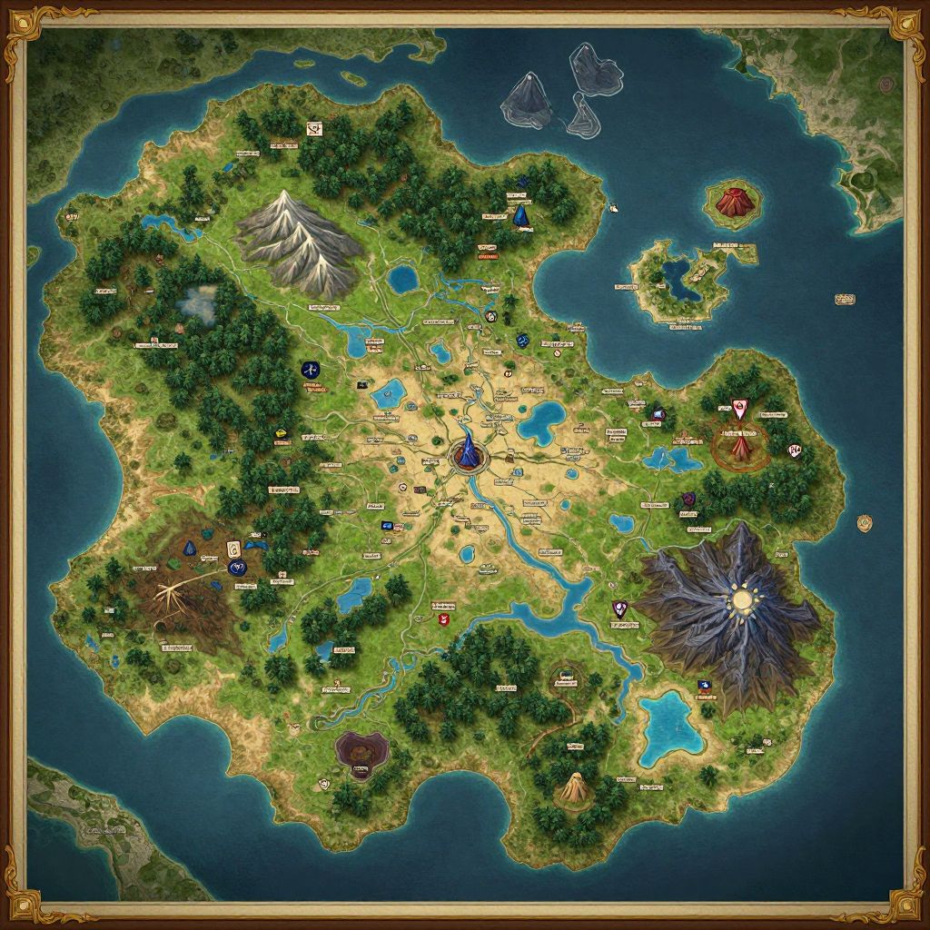 The image presents a highly detailed and vibrant map of a lush, open-world fantasy realm, reminiscent of a magical, volcanic landscape. The map is richly textured, with a variety of colors that enhance the sense of depth and dimension. The terrain is diverse, featuring verdant forests, rugged mountains, and expansive lakes. The map is adorned with intricate symbols and labels, indicating various locations, landmarks, and possibly different regions or zones within the world. The layout is well-organized, with clear demarcations between different areas, making it easy to navigate. The overall composition is balanced, with a mix of natural and man-made elements, creating a harmonious and immersive visual experience. The map is framed with ornate borders, adding a touch of elegance and sophistication to the design.