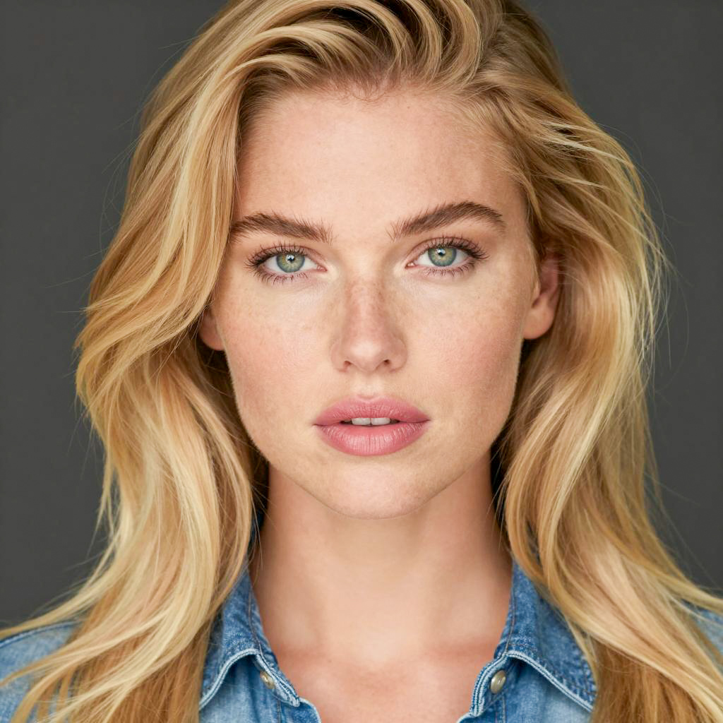 Black-and-white photograph of a woman with wavy, shoulder-length blonde hair, light skin, and gentle smile. She has light-colored eyes, slightly arched eyebrows, and wears a light-colored top. Background is blurred and dark. Face is centered, occupying most of the frame.