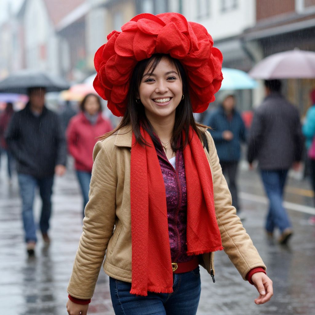 Photograph of a smiling woman with fair skin and dark brown hair, wearing a large, vibrant red hat with numerous ruffled layers. She has on a beige leather jacket over a purple patterned shirt, paired with a bright red scarf, and blue jeans. She is walking on a wet, rainy street with blurred background figures holding umbrellas. The street is lined with buildings, and the ground reflects the overcast light. Her confident stride and cheerful expression contrast with the gloomy weather. The image has a slightly over-saturated color effect, emphasizing the red hat and scarf.