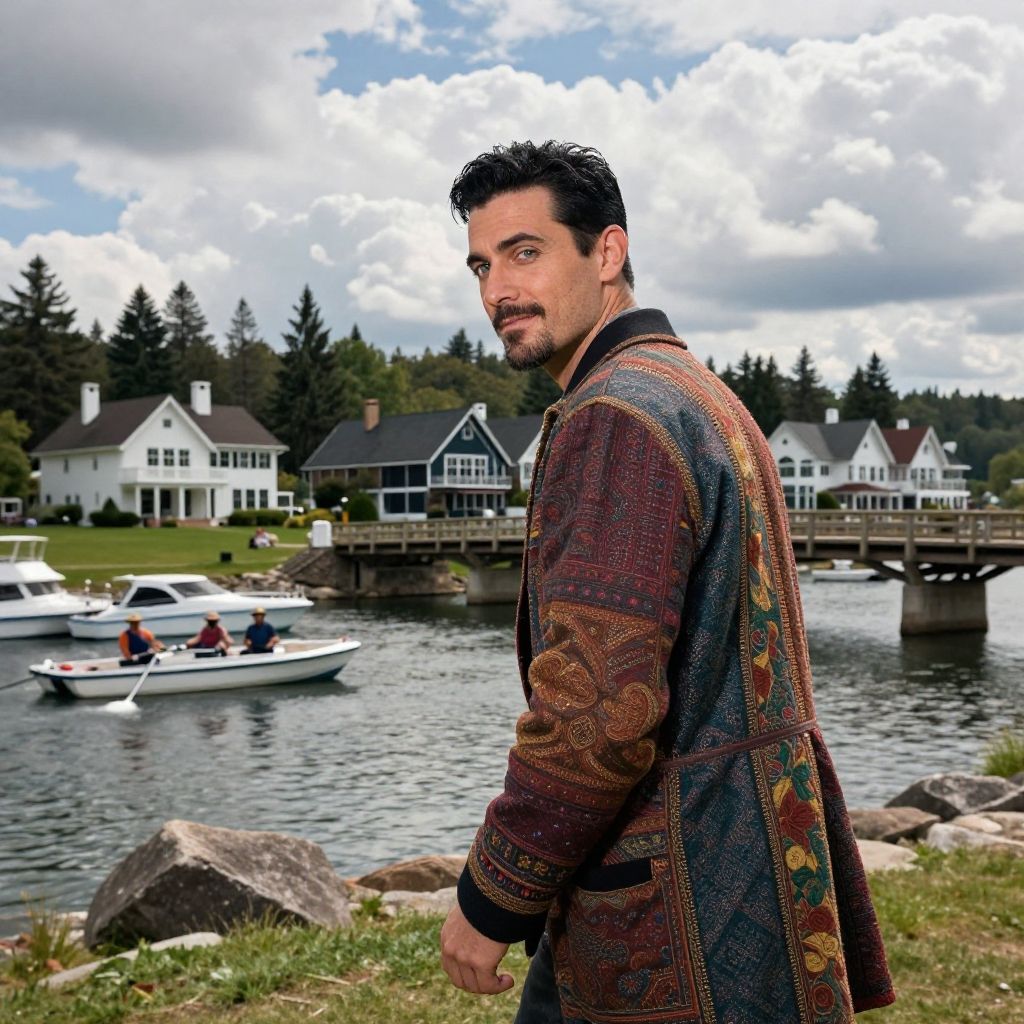 (1man), short-goatee, short raven black hair, walking by the lake, looking back over shoulder, smile, colorful outerwear, realistic, photograph, (masterpiece), 8k quality, (detailed eyes:1.2), (highest quality:1.1), highly detailed, majestic, top quality, best quality, newest, ai-generated, (intricate details:1.1), extremely beautiful, elegant, immersive background+, (detailed face, perfect face), In the foreground we see a river, where there are boats docked on its banks. There are three people in a boat rowing under an old bridge. In the background, we see the river bank, which is green with large gray stones. In the background there are large houses. They all have chimneys and most of their facades are white. Behind the houses you can see a pine forest. In the background we see the sky with white clouds that have various shapes, cowboy shot