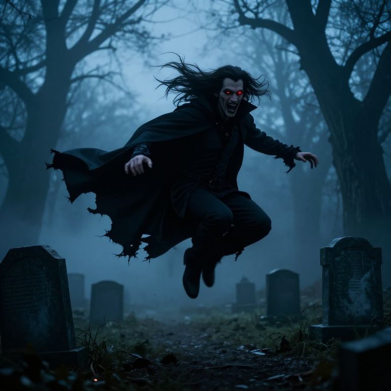 Dynamic action scene of a vampire with long hair leaping through a misty cemetery at twilight, long hair streaming behind, eyes glowing red, fangs bared, wearing a tattered dark cloak, surrounded by gravestones and twisted ancient trees, eerie and thrilling mood.
