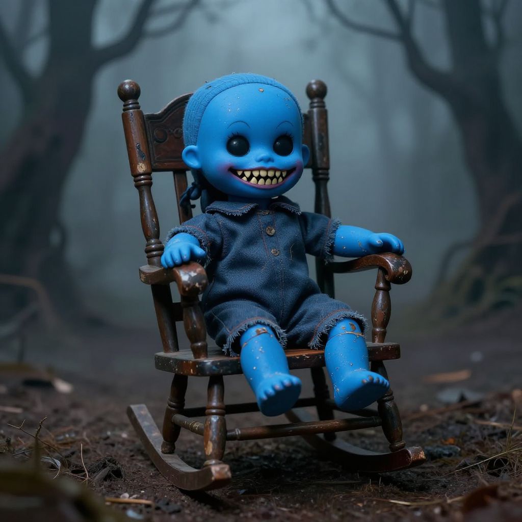 Blue doll with sharp teeth perched on a vintage rocking chair, sinister smile, worn fabric and chipped paint, foggy background with twisted trees, dark fantasy illustration