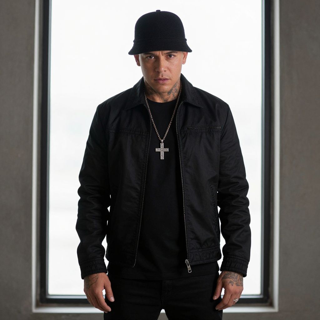 Photograph of a tattooed man with pale skin, wearing a black hat, jacket, and necklace with a cross, standing against a bright white rectangular