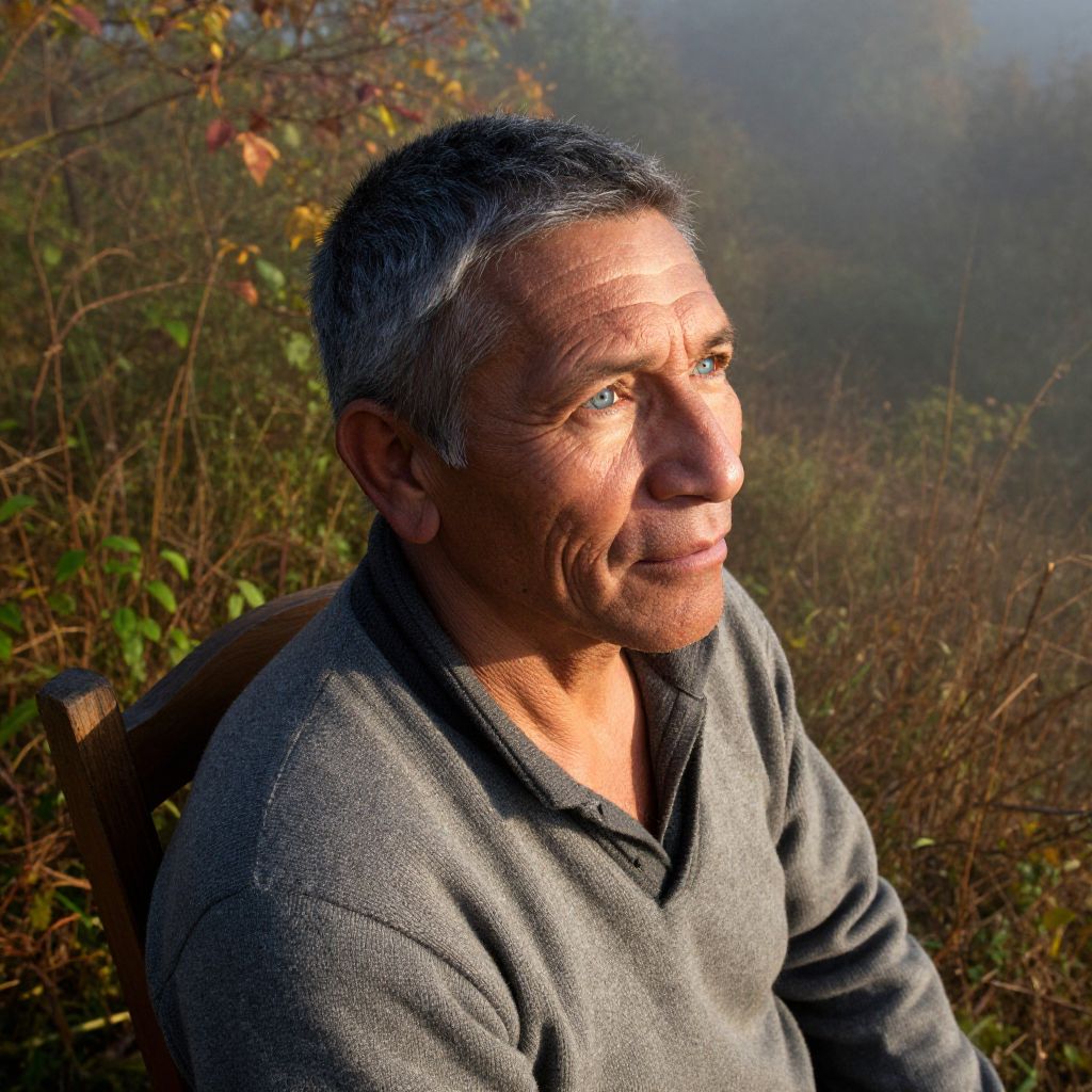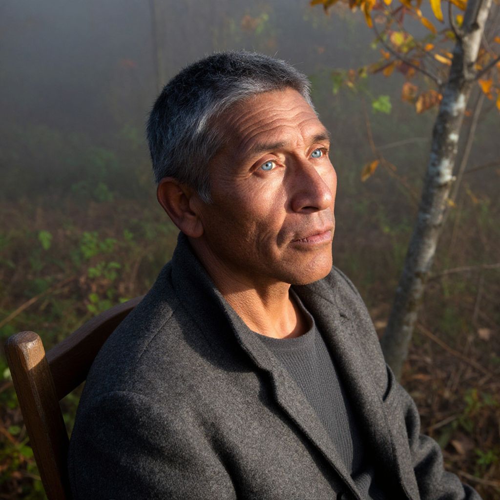 Craft a photorealistic iPhone portrait of an indigenous man with striking blue eyes and short, graying hair. Positioned in a rustic wooden chair amidst a foggy autumn morning, his expression conveys a blend of contemplation and curiosity as he gazes off into the distance. Warm sunlight filters through dense foliage, casting intricate shadows across his weathered face while highlighting his strong jawline and clean-shaven appearance. This unique bird's-eye view perspective emphasizes the interplay between light and texture on his skin and clothing, creating a dynamic visual narrative that evokes solitude and resilience amidst nature's ever-changing beauty.